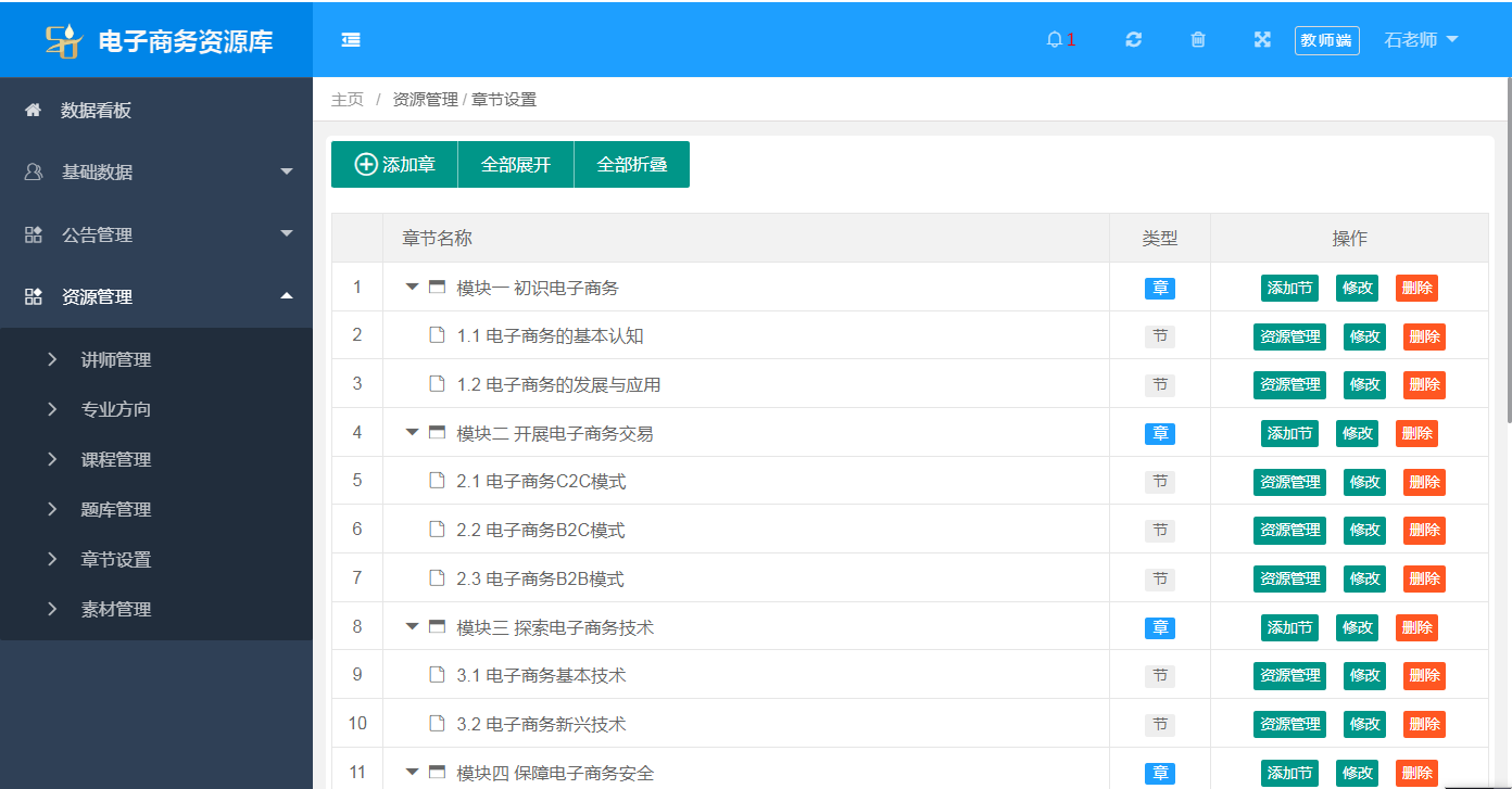 教師端的基(ji)礎數據包括(kuo)數據看板,基(ji)礎數據,公告管理,資源管理。數據統(tong)計(ji)包括(kuo)班(ban)級統(tong)計(ji),學生統(tong)計(ji),專(zhuan)業(ye)方向(xiang),課程(cheng)統(tong)計(ji),講師統(tong)計(ji),素(su)材(cai)統(tong)計(ji),報表統(tong)計(ji)等。