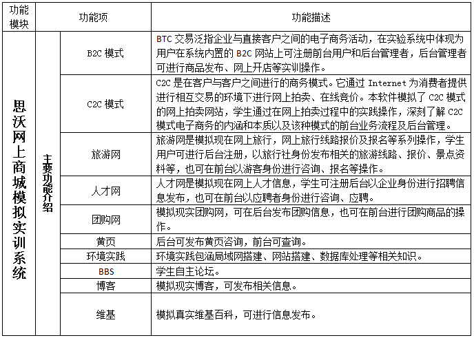 思(si)沃(wo)網(wang)(wang)上(shang)(shang)商(shang)城(cheng)模擬實(shi)訓(xun)系(xi)統(tong)充分考(kao)慮到(dao)了試驗的(de)具體(ti)情況,系(xi)統(tong)針對網(wang)(wang)上(shang)(shang)商(shang)城(cheng)模擬實(shi)訓(xun)進行相(xiang)關配置,學生可在(zai)系(xi)統(tong)中體(ti)驗網(wang)(wang)上(shang)(shang)B2C、C2C模擬商(shang)城(cheng)開店實(shi)訓(xun)并結合網(wang)(wang)絡(luo)環境(jing)的(de)搭建、數(shu)據庫(ku)運用(yong)知識(shi)、團購網(wang)(wang)、在(zai)線旅游(you)網(wang)(wang)、在(zai)線人(ren)才網(wang)(wang)等進行多元性的(de)實(shi)訓(xun)系(xi)統(tong)。