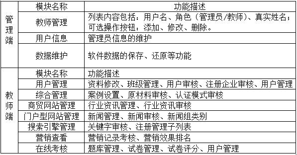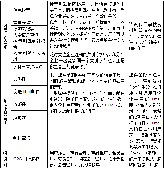 1、軟件用戶從初次(ci)訪問(wen)企(qi)業(ye)(ye)網站(zhan)(zhan)(zhan)到跟該企(qi)業(ye)(ye)訂購產(chan)品(pin)的整個(ge)過程,可將其分成三個(ge)階(jie)段(duan):網站(zhan)(zhan)(zhan)建(jian)設(she)階(jie)段(duan)、營(ying)(ying)(ying)銷(xiao)(xiao)推(tui)廣階(jie)段(duan)和在(zai)線業(ye)(ye)務管理階(jie)段(duan)。模(mo)塊中應包括:網站(zhan)(zhan)(zhan)建(jian)設(she)、搜索(suo)引(yin)(yin)擎營(ying)(ying)(ying)銷(xiao)(xiao)、郵件推(tui)廣、網絡溝通(tong)、信息搜索(suo)與發布、搜索(suo)引(yin)(yin)擎優化、網絡廣告制(zhi)作(zuo)、、客戶服務、在(zai)線銷(xiao)(xiao)售等(deng)技能的專項實訓(xun),也能將專項實訓(xun)匯總(zong),方便學生開(kai)展企(qi)業(ye)(ye)網站(zhan)(zhan)(zhan)綜合營(ying)(ying)(ying)銷(xiao)(xiao)、作(zuo)出網絡營(ying)(ying)(ying)銷(xiao)(xiao)效果(guo)評估等(deng)的集(ji)中實訓(xun)。