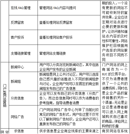(2)企業網(wang)站管理(li)與營銷:模(mo)塊什(shen)么時候需要維護?新(xin)聞管理(li)有何(he)(he)用(yong)處?如何(he)(he)管理(li)網(wang)站會員?FAQ對網(wang)站有什(shen)么幫助(zhu)?是否(fou)留意(yi)反饋信息?是否(fou)解決顧客投訴?是否(fou)需要友情鏈接(jie)?